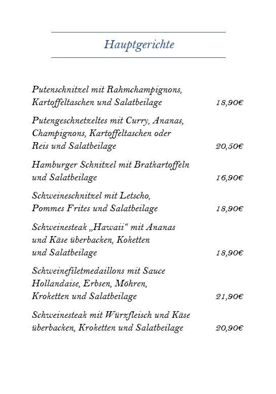 Wir legen Wert auf Tradition und Qualität. Unsere Speisekarte bietet eine vielfältige Auswahl an deutschen Klassikern, zubereitet mit frischen Zutaten. Erleben Sie authentischen Geschmack in gemütlicher Atmosphäre.